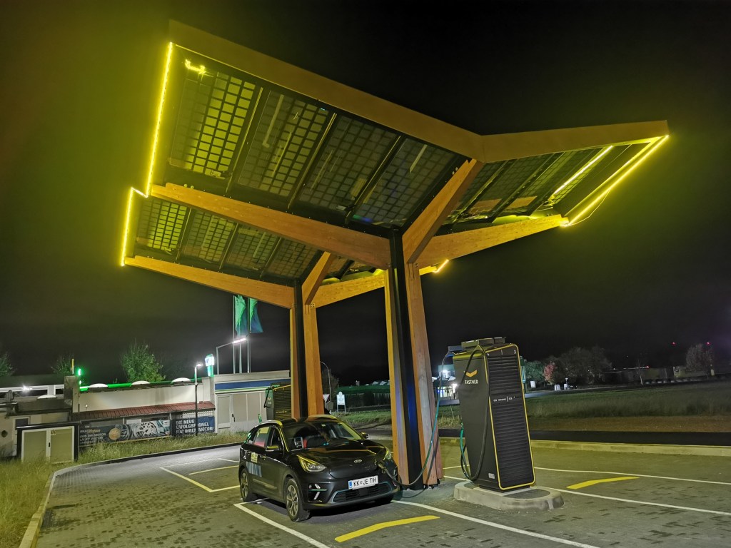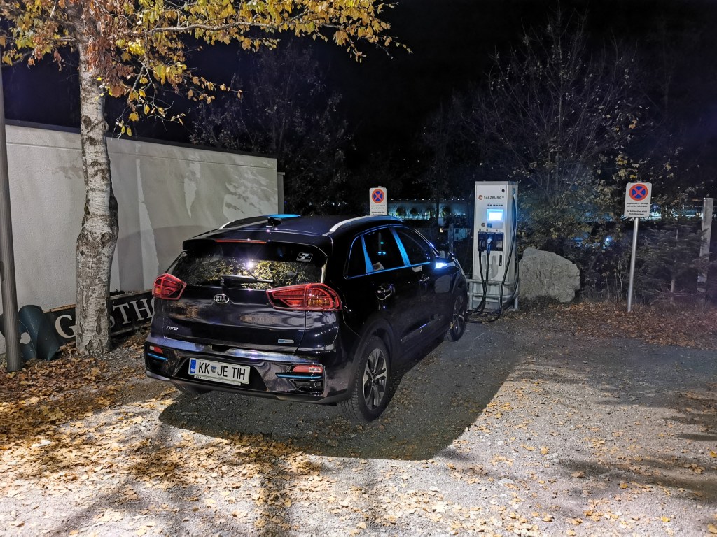 Na tej postaji sem že hotel polniti pred časom (Dunaj). Takrat je bila napaka na polnilnici, saj ni imela povezave z internetom in ni mogla preveriti kartice. No, ta polnilnica je tokrat delovala. Tudi ta lokacija je super, spet le “pljunek” z avtoceste. Zraven te hitre polnilne postaje se nahaja Spar trgovina. Kar luštna.