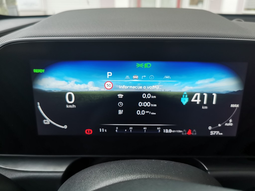 Voznikov zaslon ima več možnosti prikaza, meni je bil še najbolj všeč ta desni. Nisem pristaš kazalcev, hitro je +- 10 km/h, pri številki pa sicer traja malenkost dlje časa, da možgani sprocesirajo podatek ampak je pa bolj točen. Hitrost se lahko seveda nastavi tudi na sredinski del zaslona, meni pa tam bolj ustreza podatek o trenutni poti. Tudi podatek, koliko moči gre trenutno za pogon, mi nekako ne pomeni kaj veliko (čeprav je še vedno viden kot horizontalna črta spodaj na zadnjem prikazu).